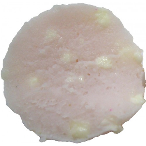 圓形薄餅狀,上下皆有烤過黃金色,粉紅色的魚漿類似桃子的顏色,上面的白點是固狀的甜口味起司,日本的魚漿口感非常Q軟,完全跟台灣的不一樣,口味偏向類似少女甜點的夢幻口味,微甜的乳酪起司完全配合魚漿的鮮甜。