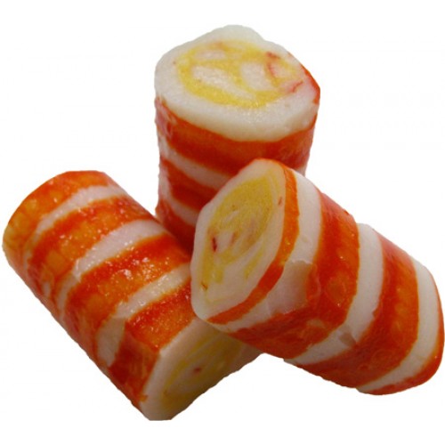 大龍棒的形狀,白橘條紋相間,中心混合橘色雪魚漿塊及些許魚蛋,每一口都可以吃到A級雪魚漿的甜味,每一口咬下去外層漿體口感Q彈到中間非常有層次的顆粒,看切面就知道,川島出品魚漿保證。